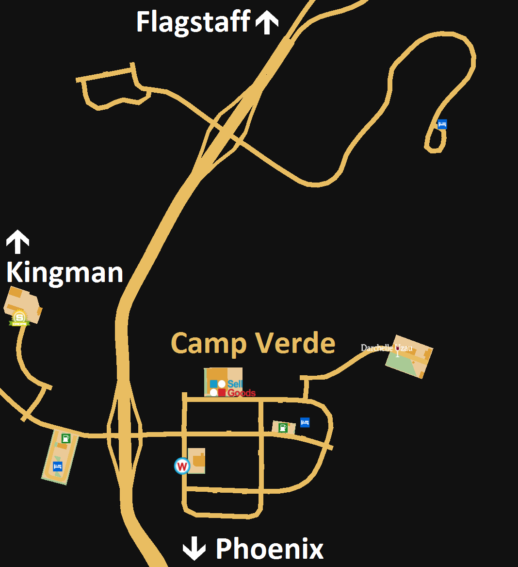In Camp Verde findet man neben einer Tankstelle und einem Rastplatz auch ein Darchelle Uzau-Weingut, ein kleines Sell Goods-Depot, und einen Wallbert-Supermark.