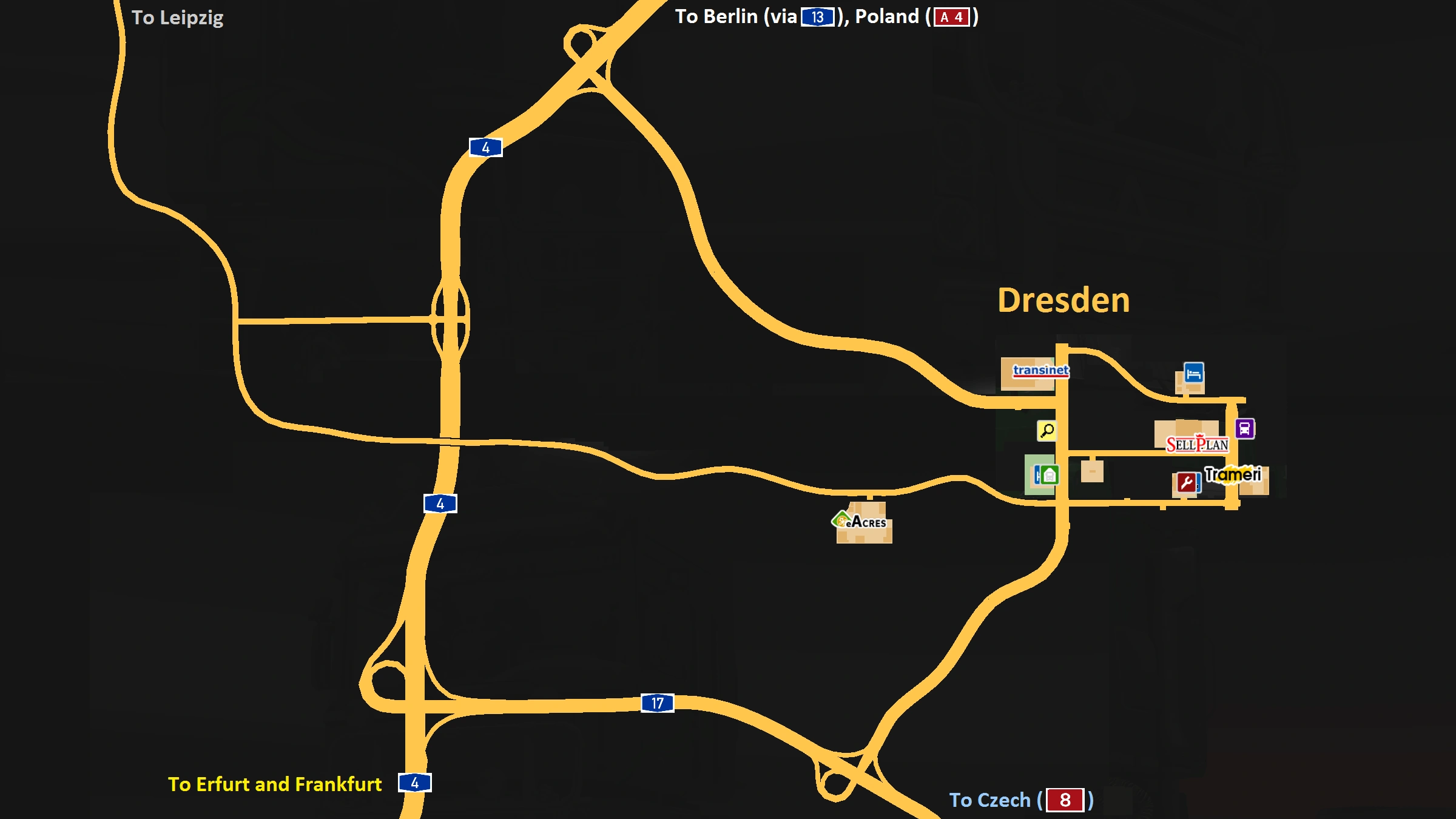 Zu den Einrichtungen, die man in Dresden finden kann, gehören eine Arbeitsagentur, ein [[Busbahnhof], eine Garage, ein Hotel, eine Werkstatt und ein kleiner Scania-Händler.