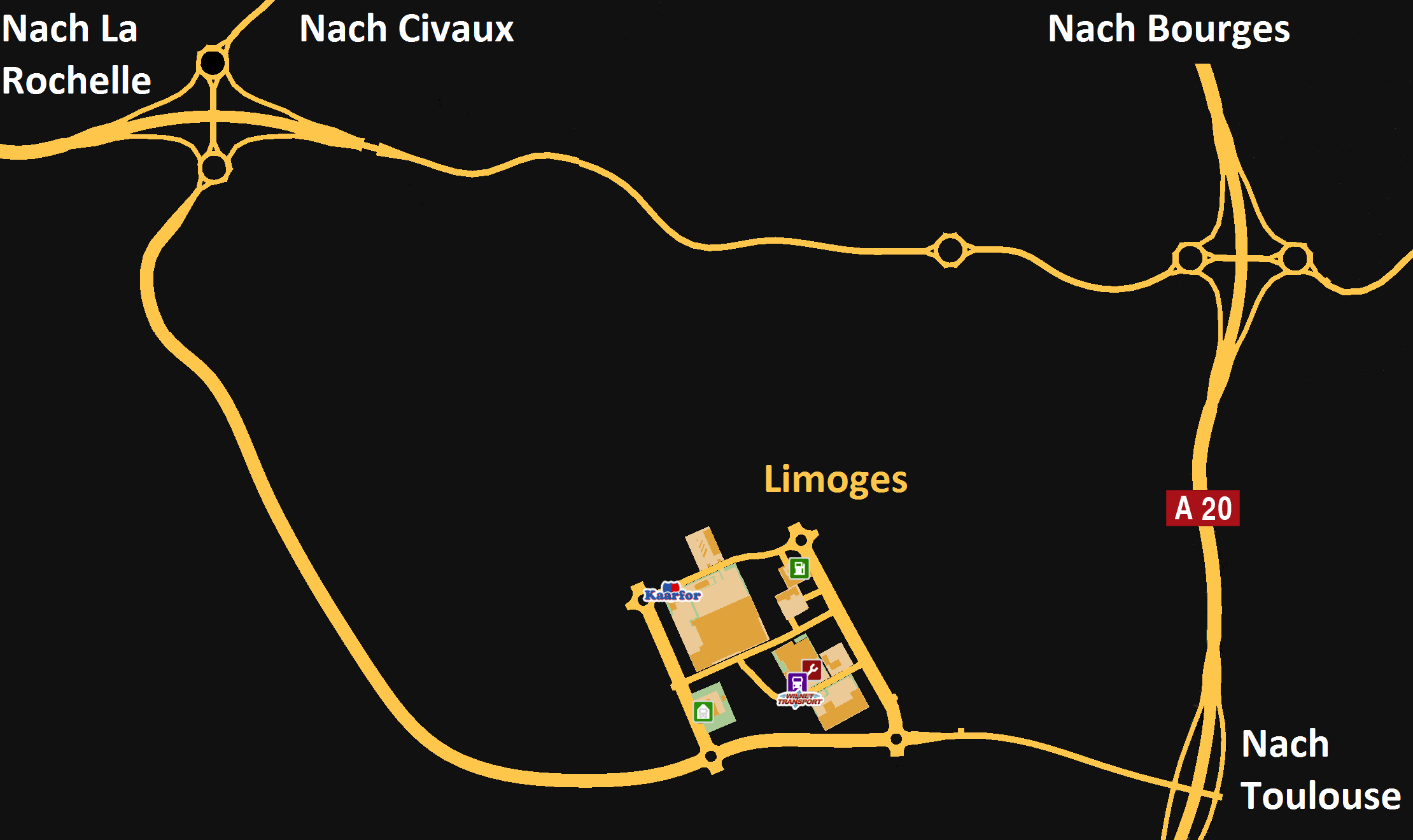 Die einzige Autobahn, die direkt an der Stadt vorbeiführt ist die Autoroute A20, die im Süden eine Verbindung mit Toulouse und im Norden mit Bourges bildet. Einige Kilometer südlich der Stadt kreuzt die Autoroute A89 die A20 und verläuft im Westen nach Bordeaux und im Osten nach Clermont-Ferrand. Außerdem verbindet eine Landstraße Limoges direkt mit Clermont-Ferrand im Osten und mit der Autoroute A10 im Westen.