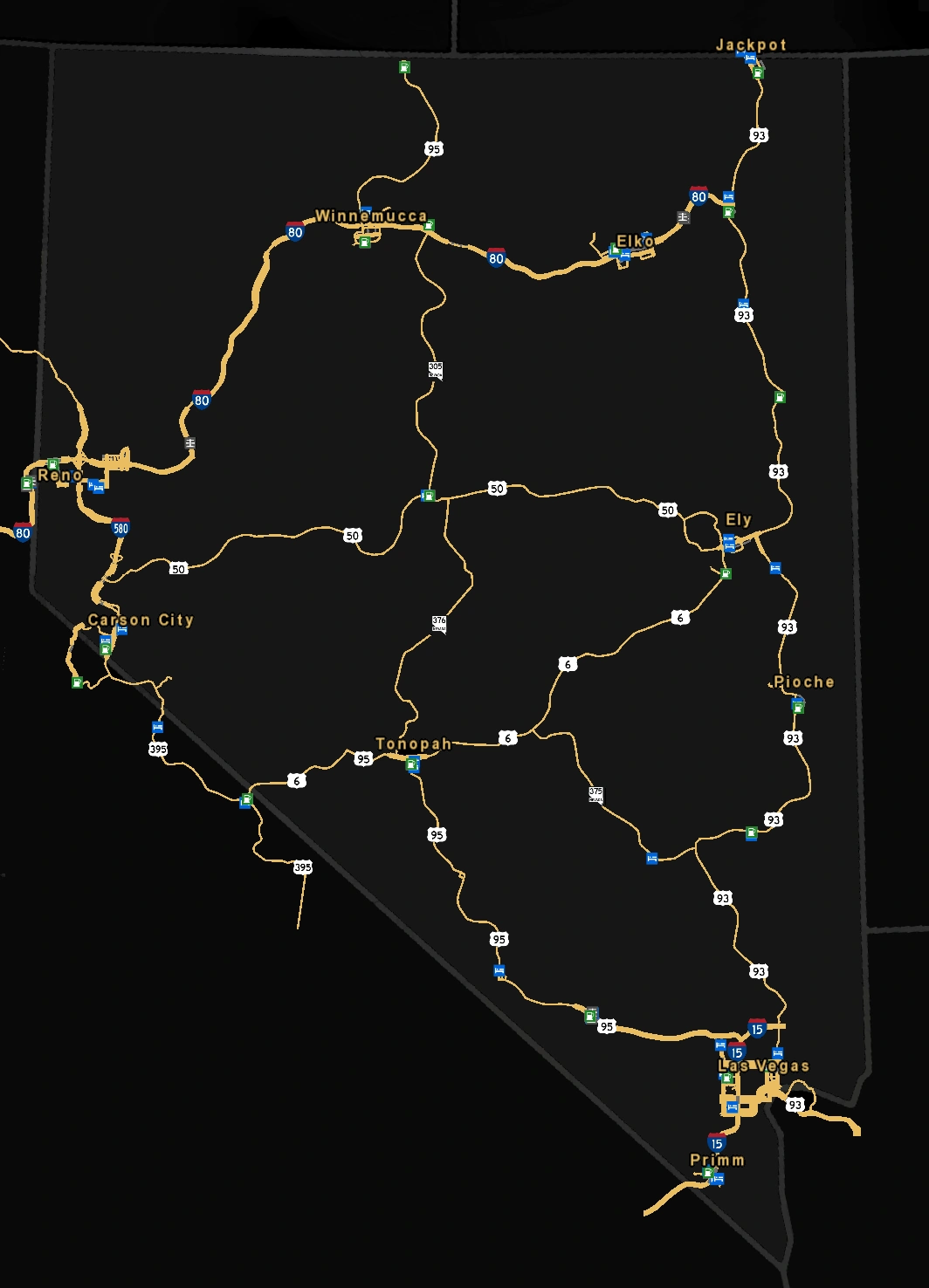Nevada ist ein völlig von Land umschlossener Bundesstaat der USA, der demnach auch in American Truck Simulator enthalten ist. Er grenzt an Kalifornien im Westen, Oregon und Idaho im Norden und Utah und Arizona im Osten.