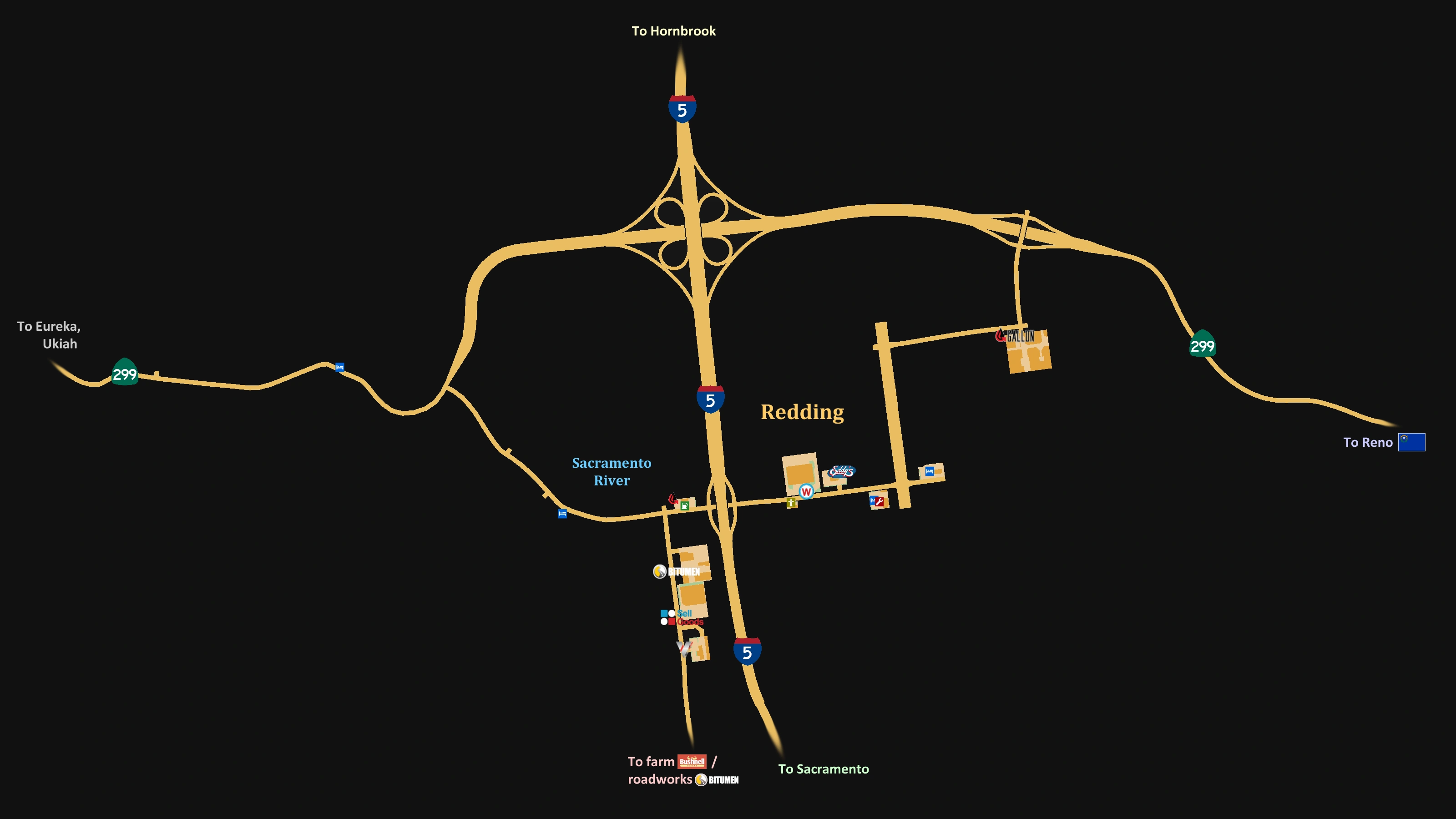 Westlich des Interstate 5 befinden sich ein Bitumen-Depot, eine Gallon Oil-Tankstelle, eine SellGoods-Niederlassung und ein Voltison Motors-Markt.