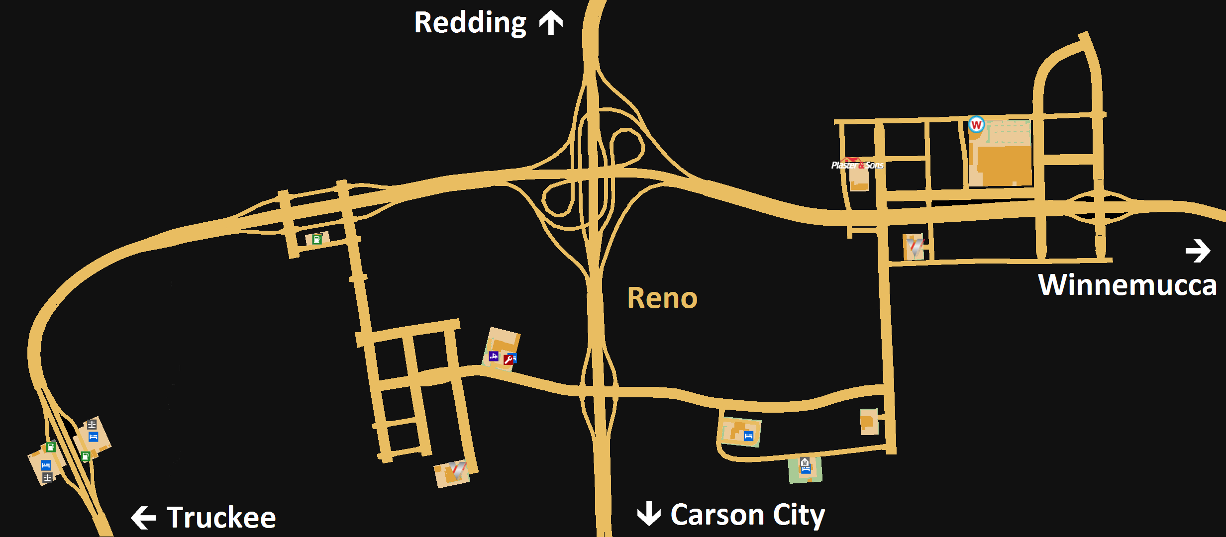 Reno ist bekannt für die vielen großen Kasinos. Einige davon sind auch im Spiel zu finden: Das Circus Circus Reno Hotel & Casino, das El Dorado Resort Casino (im Spiel: Colorado), das Harrahs Reno Hotel & Casino (im Spiel: Jarrahs), das Nugget Casino Resort (im Spiel: Nudged) und das Silver Legacy Resort Casino.