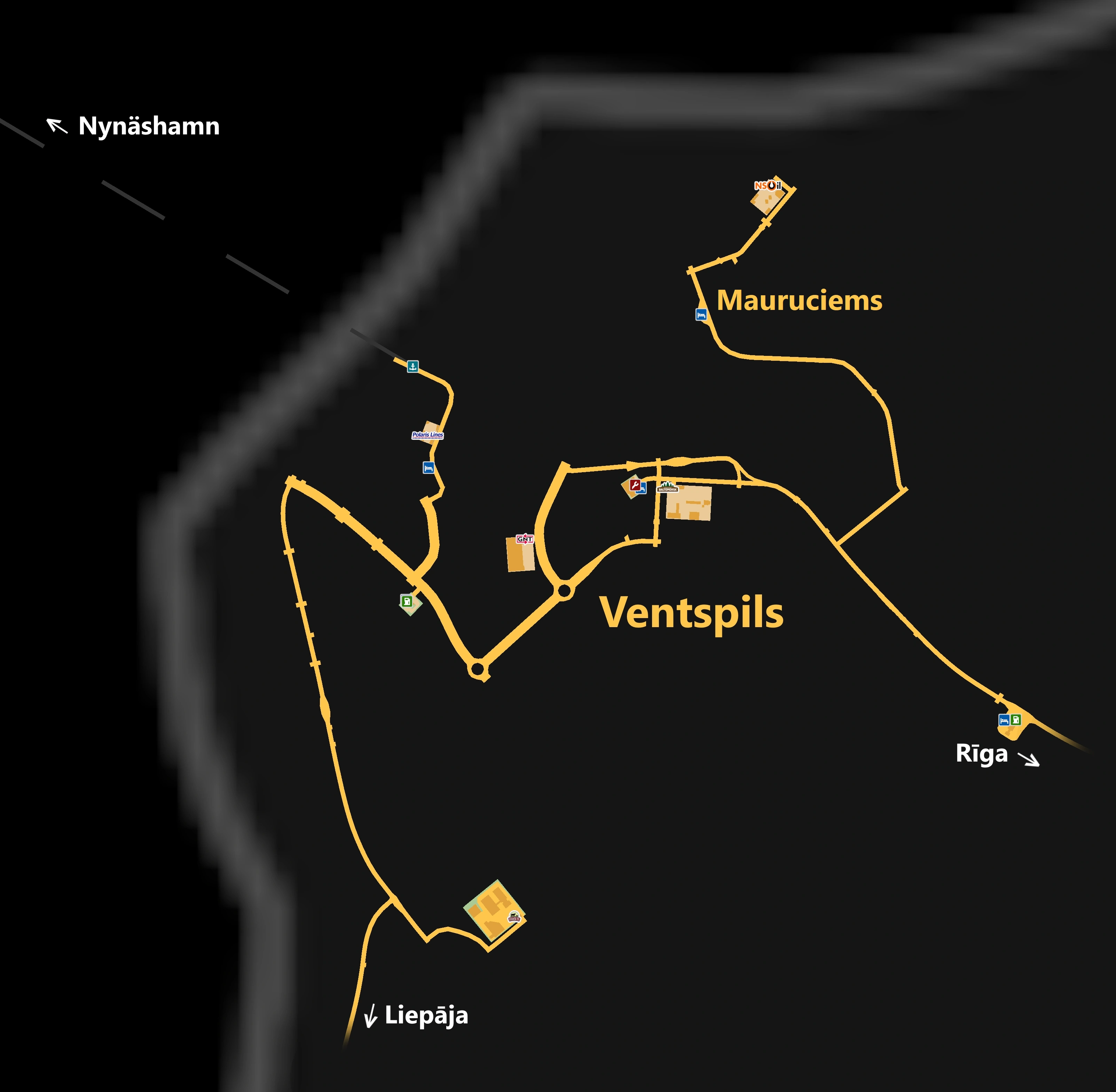 В центре Вентспилса располагаются склады компаний Baltomorsk, GNT и Polaris Lines, к северу — склады NSOil, а к югу — ферма Evikši ZS. Также в городе находятся АЗС, отель, сервисный центр и морской порт.