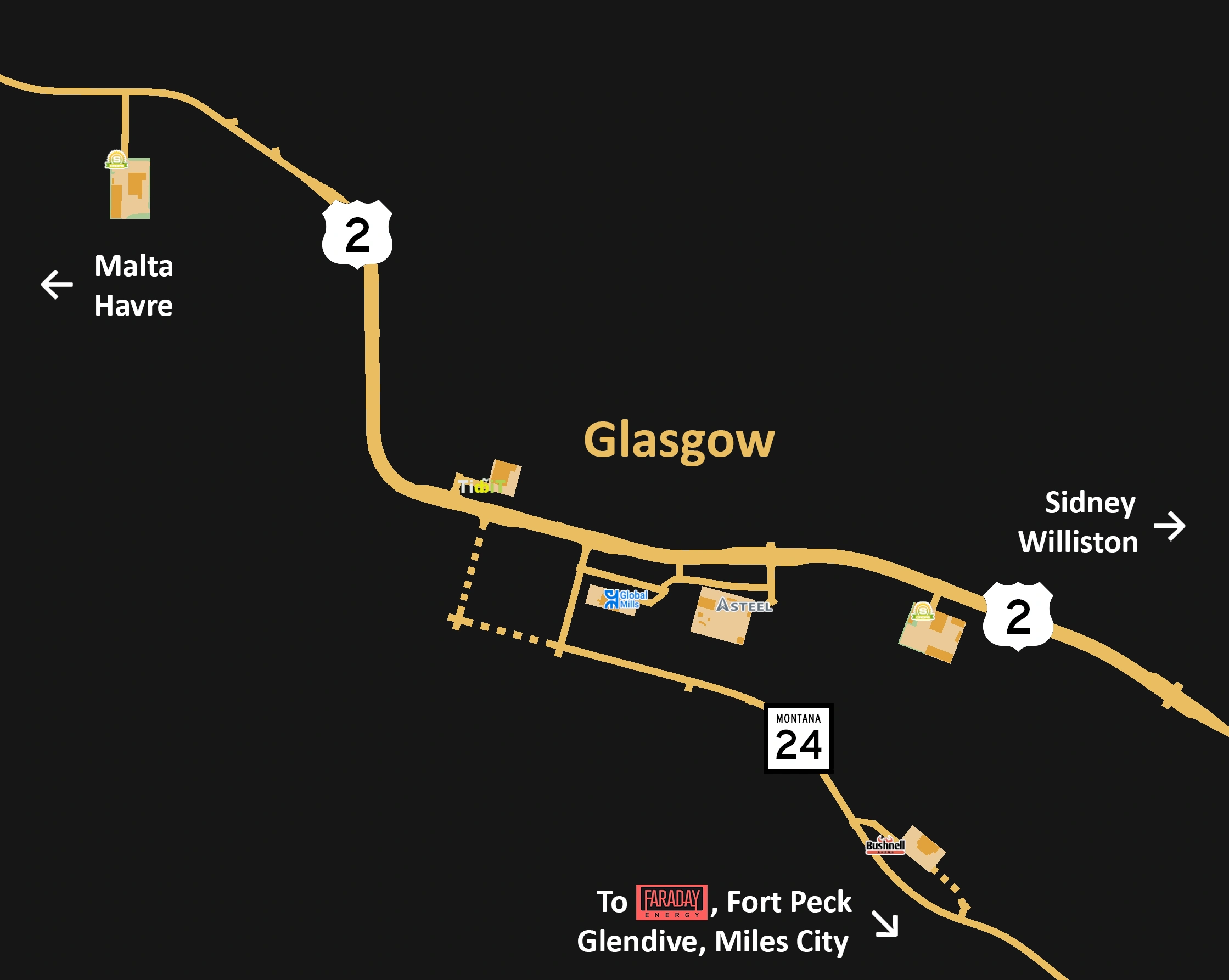 В городе находятся: свалка Avalanche Steel, зерновой элеватор Global Mills, гараж Sunshine Crops и маркет Tidbit.
