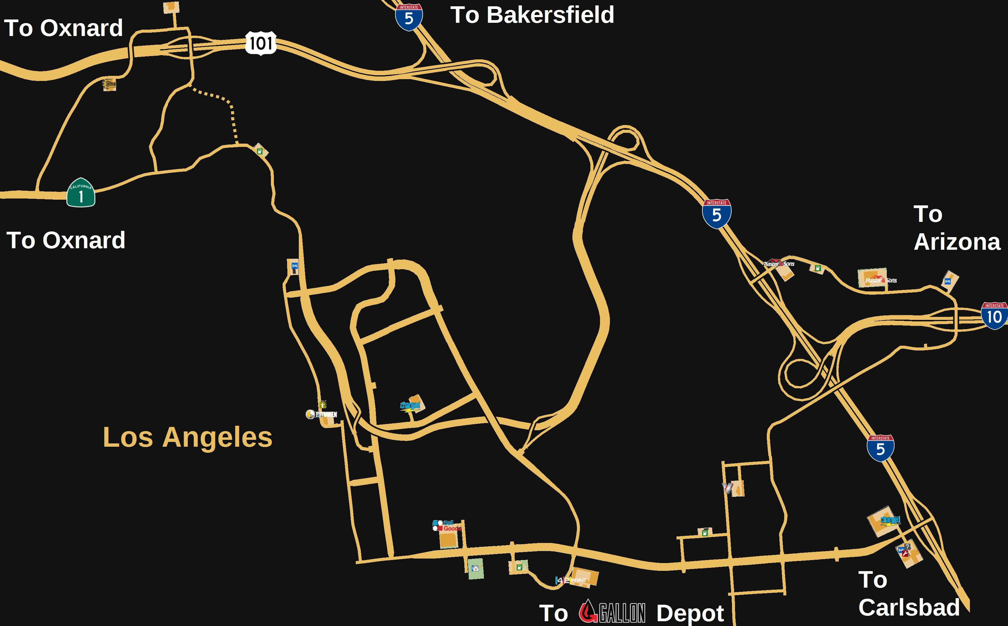 В восточной части Лос-Анджелеса находятся АЗС, автосалон Kenworth с сервисным центром, магазин Voltison Motors и депо Charged. Южнее города, в районе Лонг-Бич расположены АЗС и нефтеперерабатывающий завод Gallon Oil.