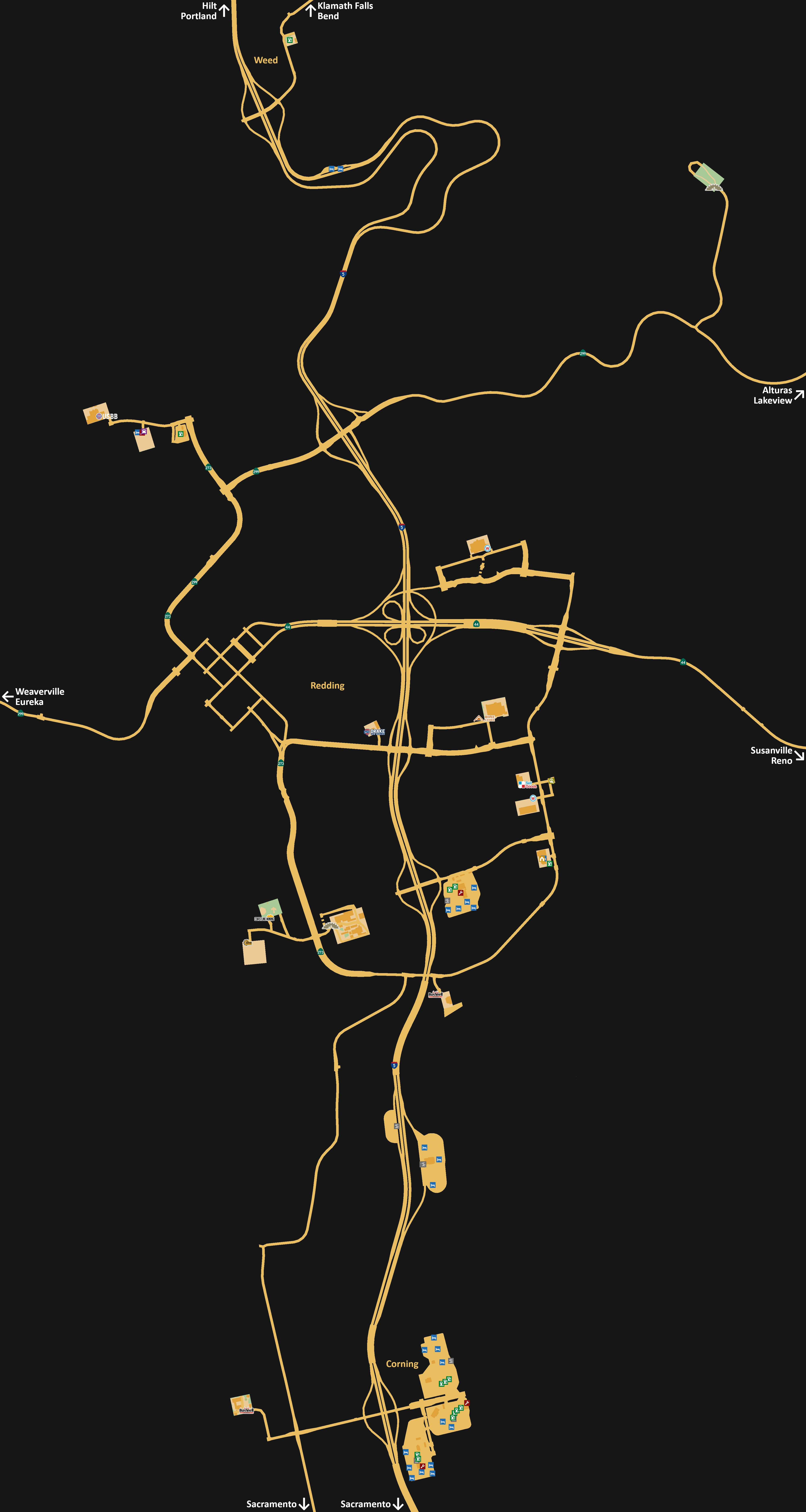 В обновлении 1.41 были убраны две зоны отдыха южнее и западнее Реддинга, весовая станция приблизилась к городу, а трак-стоп наоборот, отдалился.