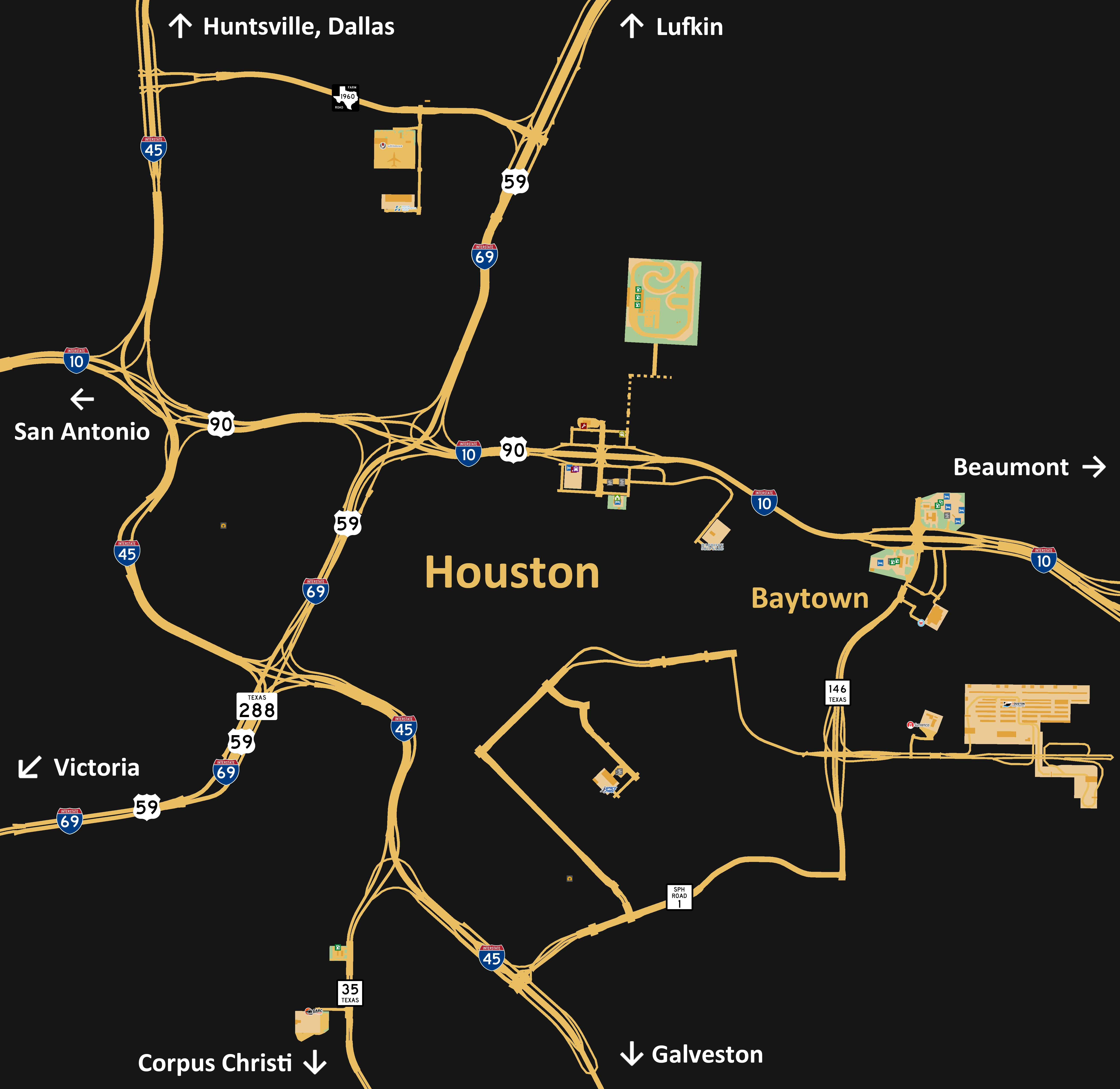 ведёт на юго-восток в Галвестон и на северо-запад в Хантсвилл и Даллас.