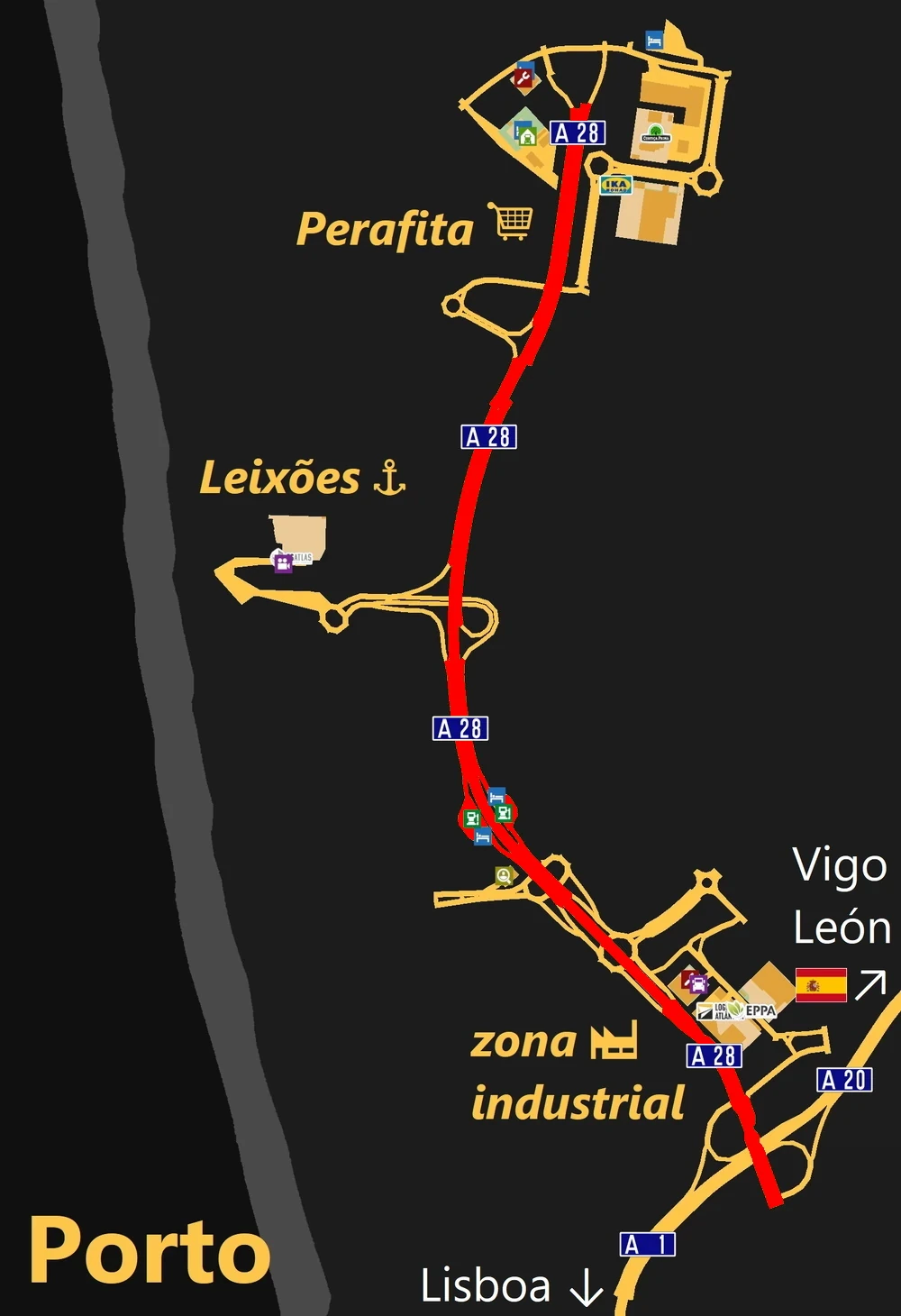 In real life, the A28 continues north along the Atlantic Ocean towards Vila Nova de Cerveira, which is located just south of the Spanish border.