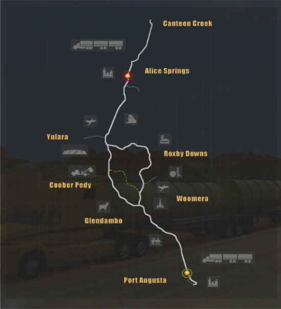 In 18 Wheels of Steel: Extreme Trucker, eight cities are featured. Three more cities, Curdimurka, Oodnadatta, and William Creek, were added in 18 Wheels of Steel: Extreme Trucker 2. In total, 11 accessible cities are in Australia.