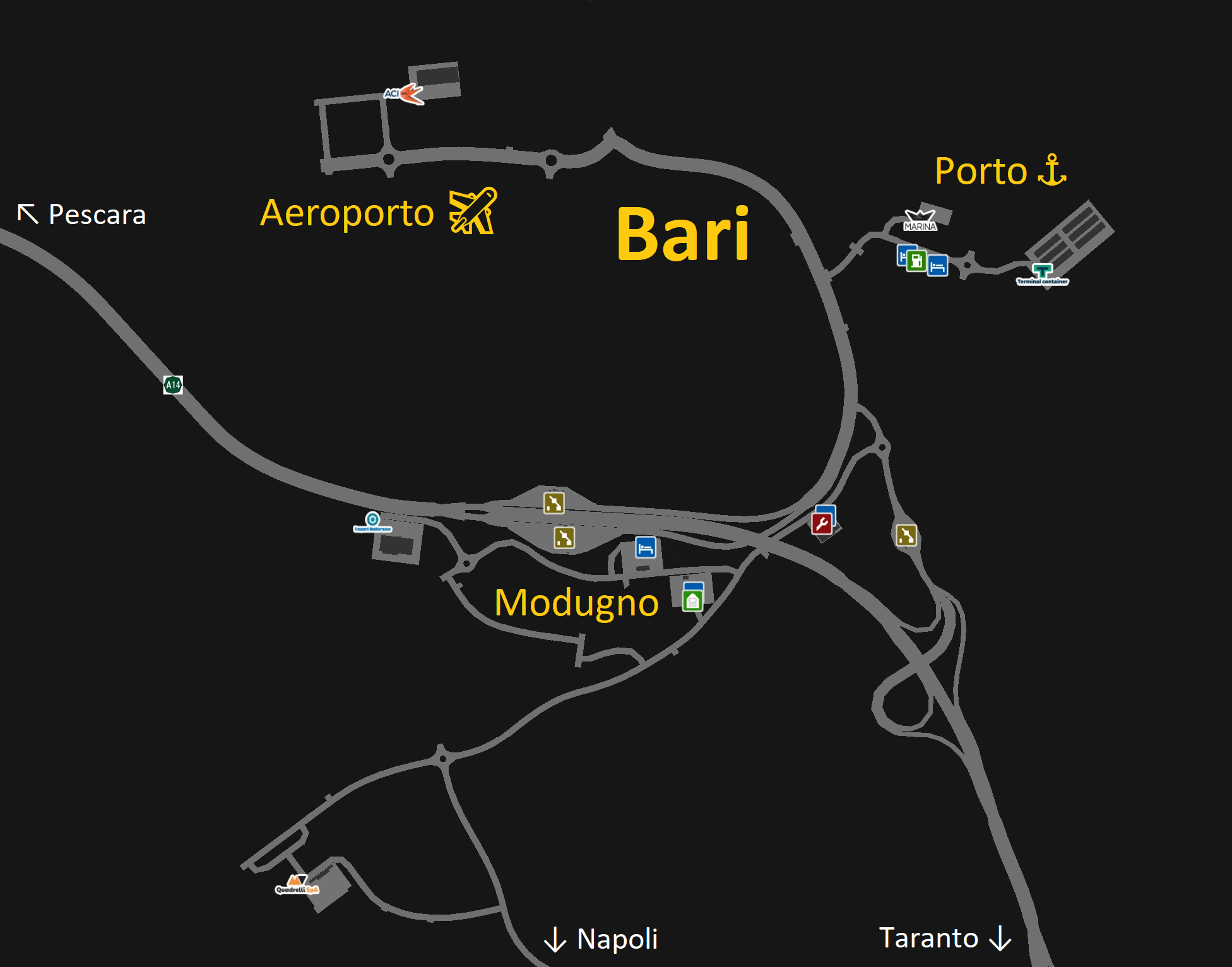 Bari is connected with the A14 which runs towards Bologna, Pescara and Ancona to the north and Taranto to the south. One can also reach Napoli via a minor road.