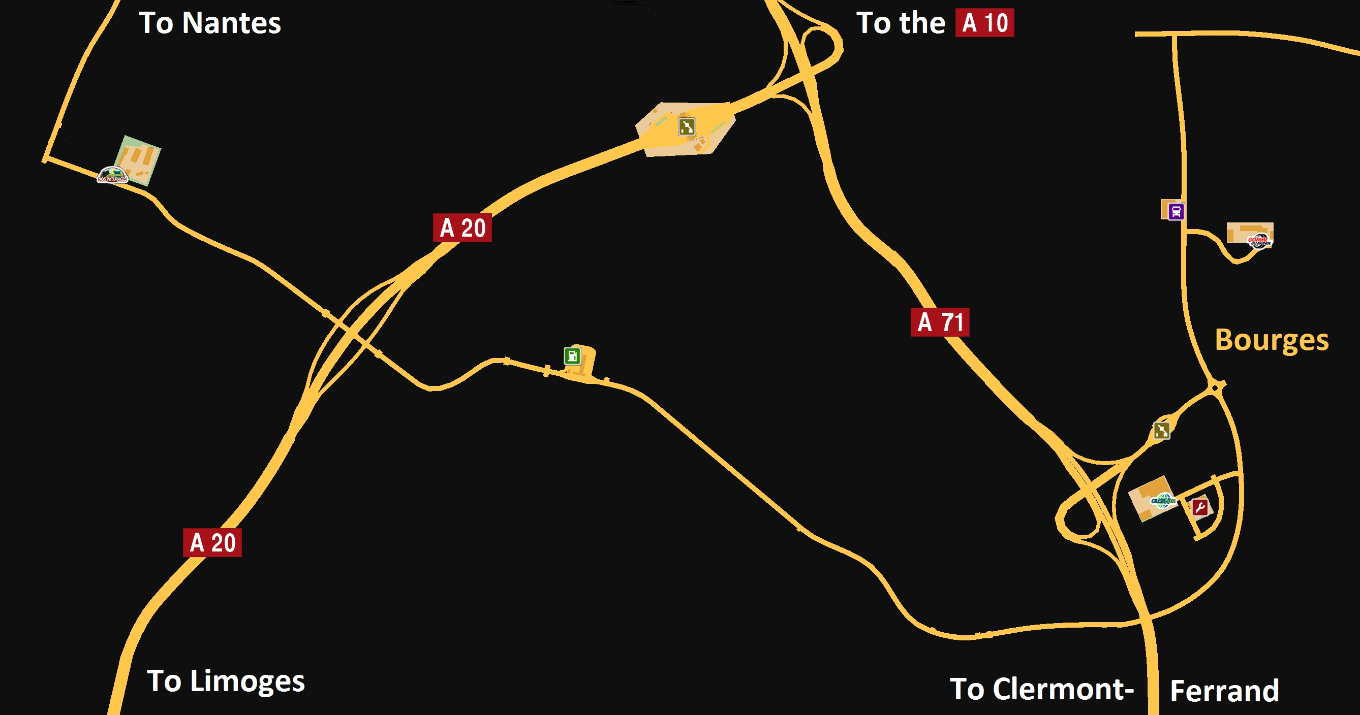 The accessible part of Bourges with the Gomme du Monde depot in the game is actually not a part of Bourges, it belongs to Saint-Doulchard in real-life. The main street of the in-game Bourges is the "Route d’Orléans".