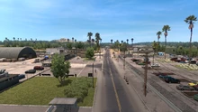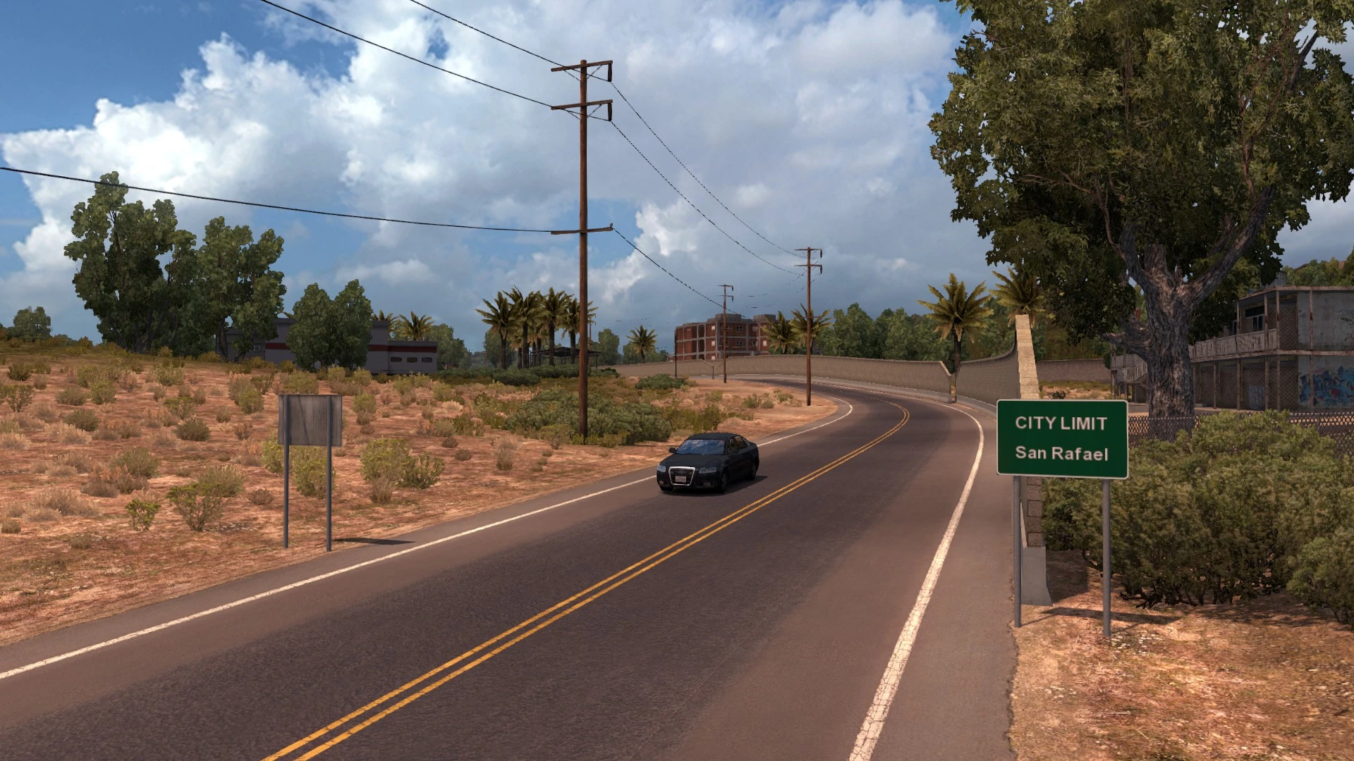 17 more cities were initially included in American Truck Simulator, bringing the total to 20. Ukiah was added in update 1.3 and Santa Maria in update 1.5. Hornbrook was replaced by Hilt in update 1.41, and San Rafael was replaced by a scenery town in the same location in update 1.44. San Jose and Modesto replaced Oakdale in update 1.50. Blythe, Indio and Mojave will be added in update 1.53. In total, there are 25 cities in California in American Truck Simulator. Official early alpha footage from 2015 featured Sacramento Valley and Santa Clara as cities, but they were removed from its final release.[20]