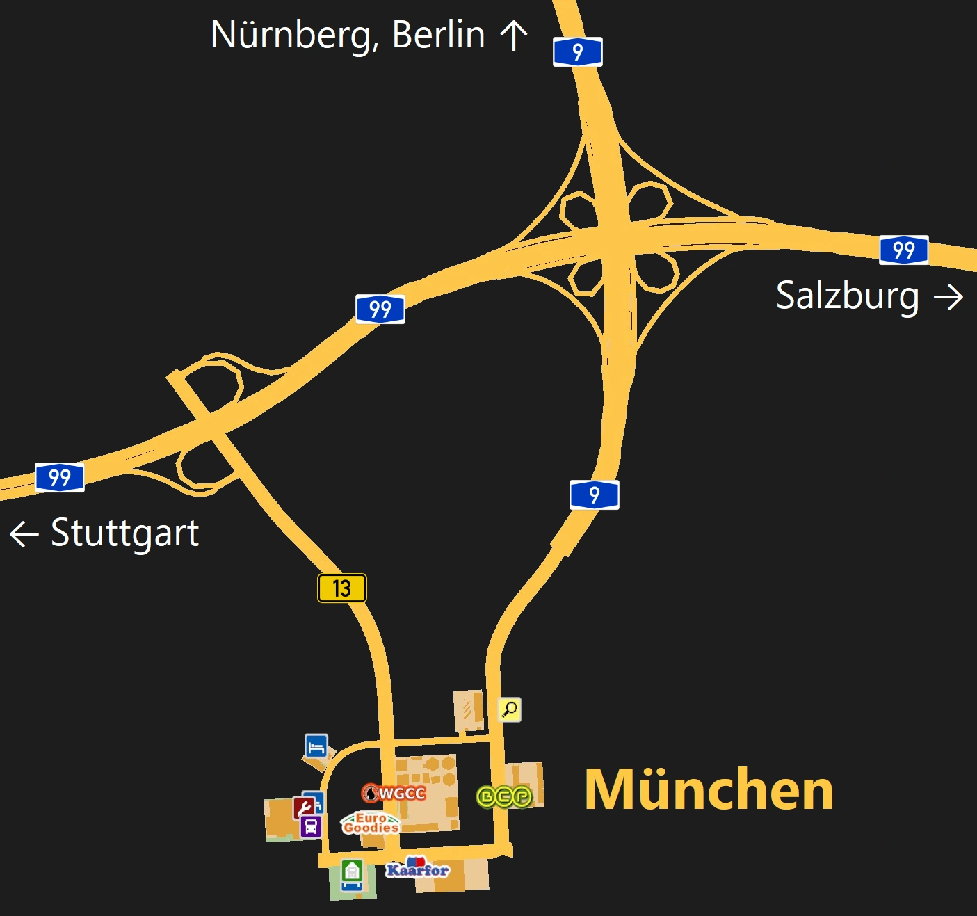 Facilities present in München include a MAN truck dealer with a service shop, a garage, a hotel and a recruitment agency.