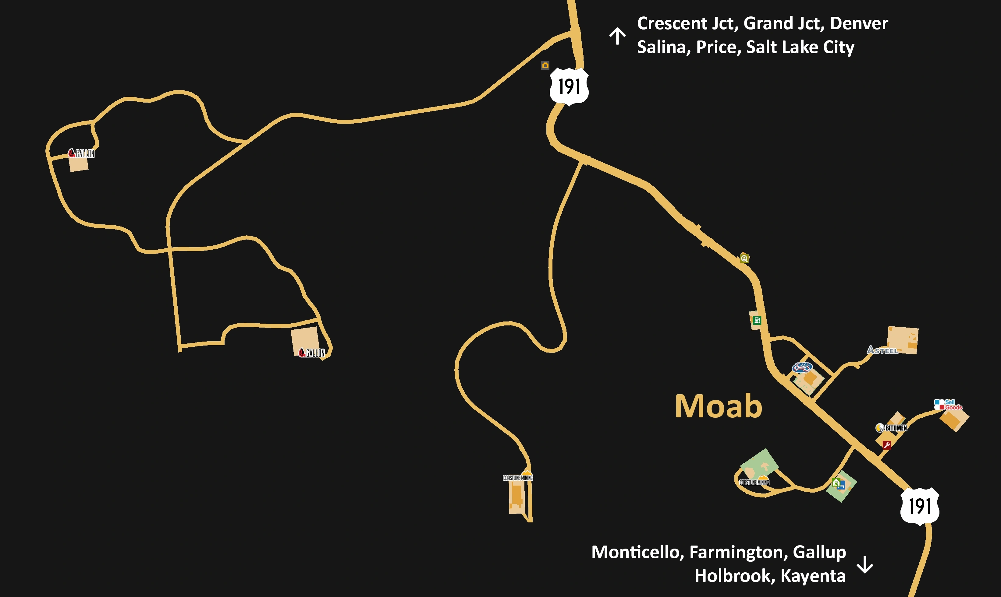 Moab features an Avalanche Steel scrapyard, a Bitumen depot, two Coastline Mining depots, an Eddy's market, two Gallon Oil oil drilling sites, and a Sell Goods warehouse.