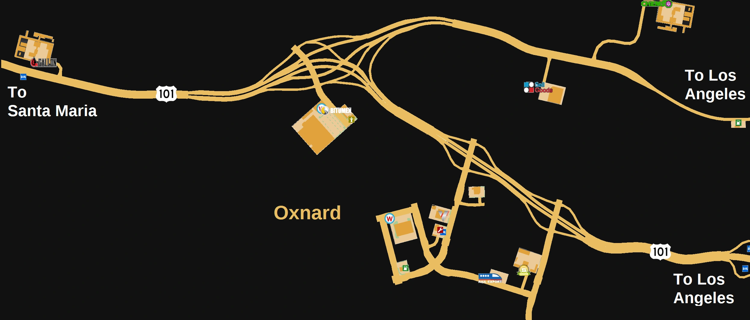 The largest part includes a Eddy's and a Voltison Motors store, a Sunshine Crops farm, a Rail Export depot and a Wallbert warehouse. Facilities in Oxnard there are a Freightliner truck dealer, a Gallon Oil gas station and a service shop.