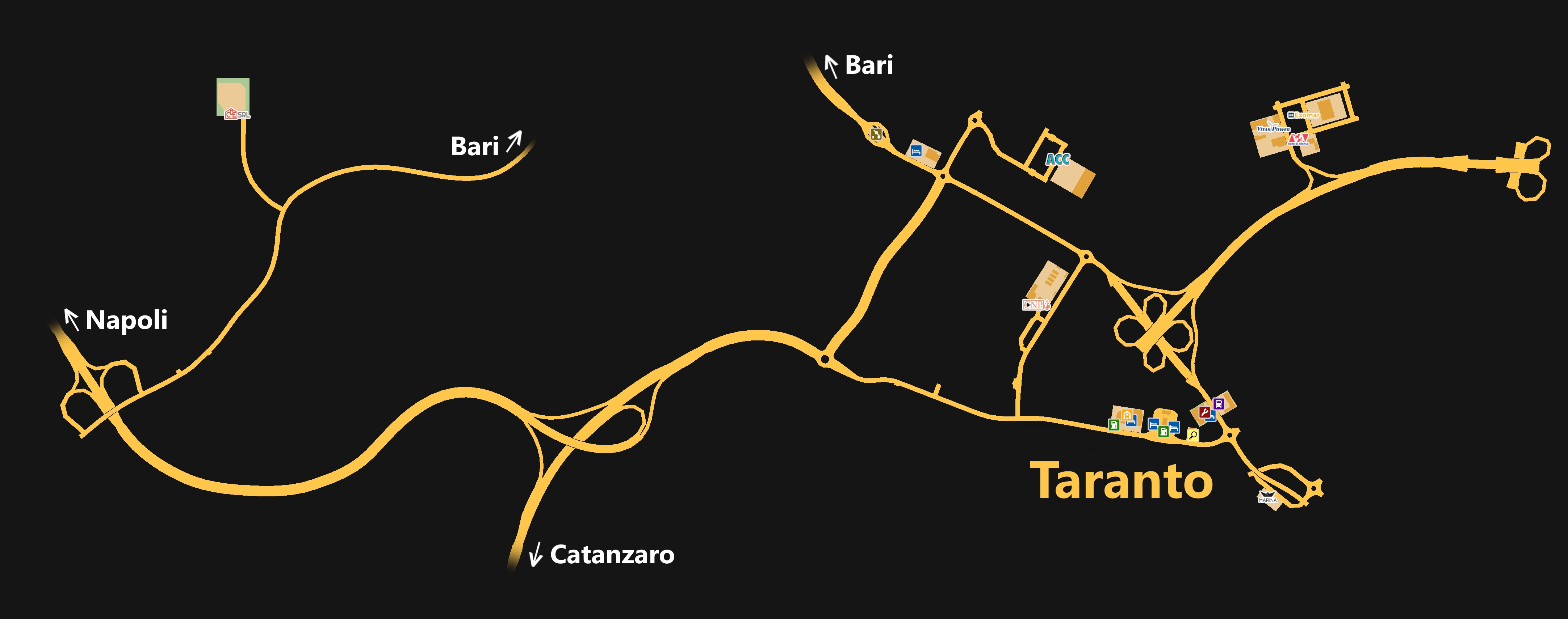 Taranto features depots of the companies ACC, AA - Auto di Alonso, CNP, Exomar and Marina. A Vitas Power depot was added in the 1.31 update. Outside the city, there is a Costruzione di Edifici depot.