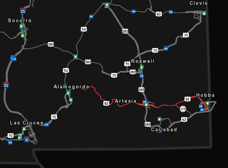 The route starts at US 54 and US 70 at Alamogordo in eastern New Mexico. It goes east and enters the town of Artesia, then Hobbs where it picks up concurrency with US 62 and goes into Texas. At Seminole, the route goes north, then starts to lean east and ends up in Lubbock. The concurrency with US 62 disappears around here, and US 82 goes east, passing through the town of Guthrie and ending up in Seymour. Here, it picks up a concurrency with US 277 and heads to Wichita Falls, where it drops US 277 off and heads toward Gainesville. The route ends here at I-35. The section between Alamogordo and Artesia runs through the Sacramento Mountains and is among the most scenic routes in the game. It passes landmarks such as Lincoln National Forest Tunnel Vista Observation Site, a tunnel through the mountains, and the town of High Rolls.